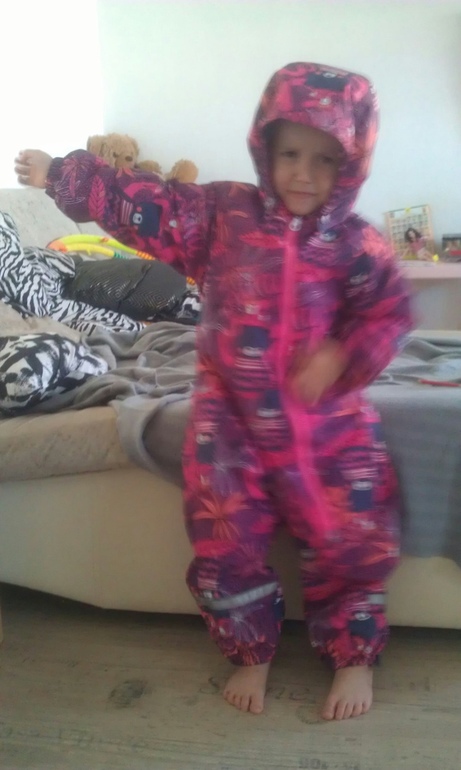 И тут уже впритык, рукава короткие и штрипки еле натянула, рост 102см: