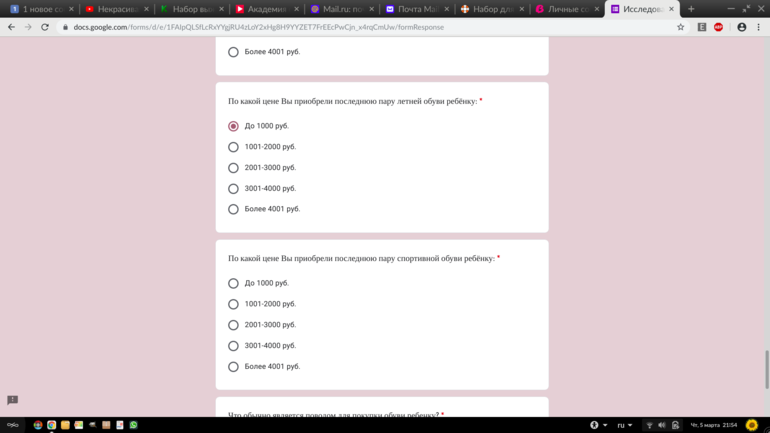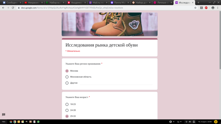 Доброго времени суток, девчат, очень нужна помощь с опросником. Опросник по детской обуви. Вот ссылка: https://docs.google.com/forms/d/e/1FAIpQLSfLcRxYYgjRU4zLoY2xHg8H9YYZET7FrEEcPwCjn_x4rqCmUw/viewform?usp=sf_link