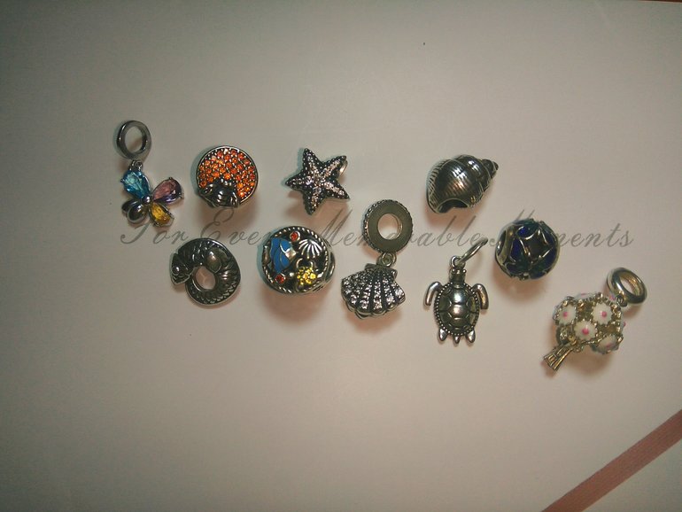 Вот к примеру выше собрали браслетик на лето(два вида ракушек,черепашка,морская звезда,пчелка на медовых сотах,букет полевых цветов,коралловый риф,хамелеон и бабочки) мысленно уносят нас в тёплое лето,от этих шармиков поднимается настроение