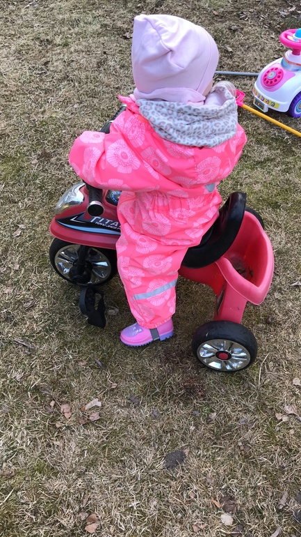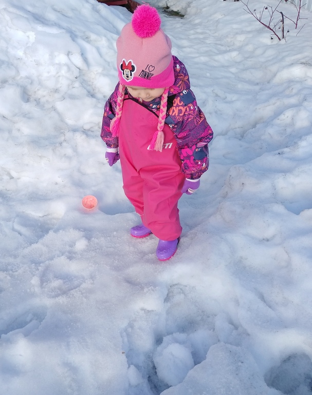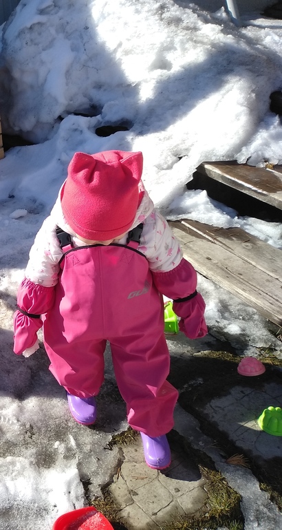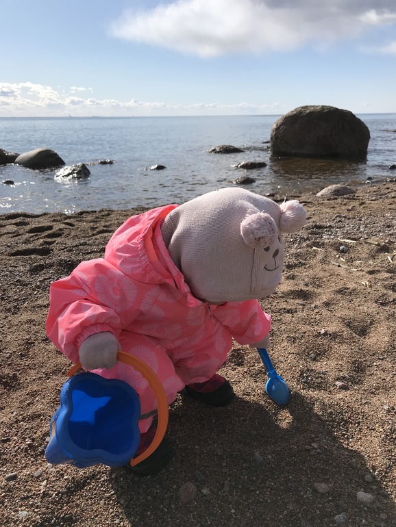 Ещё любит в ведро кидать мячик с небольшого расстояния. Камушки собирает в ведёрко и приносит показать, что нашла:) На потеплее. Одену штаны и безрукавку. Опять же, резиновые сапоги. Ей почему-то в этих сапогах удобней, чем в кроссовках или ботинках. Надо мне практиковаться, может неудобную обувь беру.