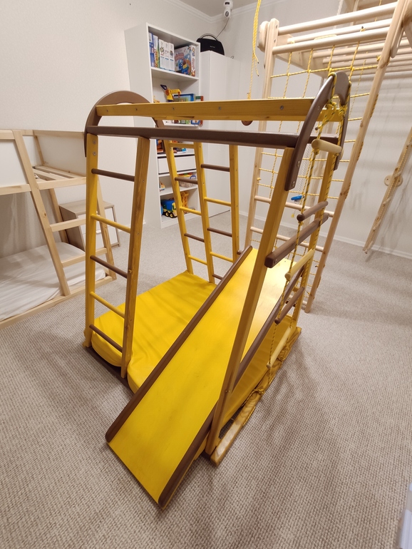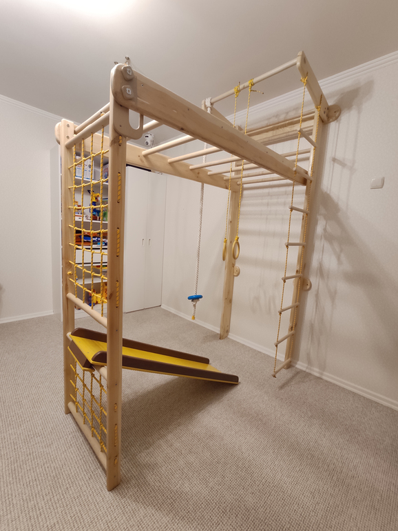 Мы его взяли на вырост, по скидочной цене подвернулся. А раз уже взяли, то периодически расчехляем для разнообразия. Старшему 4.10 года, он взбирается по сетке и идет до стены по верхней части. Всё. Канат - пока не может, тарзанка - тоже, веревочная лестница - аналогично. Этими кольцами пользуется средний, у старшего другие, из потолка висят, там же и качеля. Среднему 2.9 года, он по сетке поднимается наверх и на этом все. Есть у нас к нему еще горка родная, она на чердаке, но точно такая же как желтая: