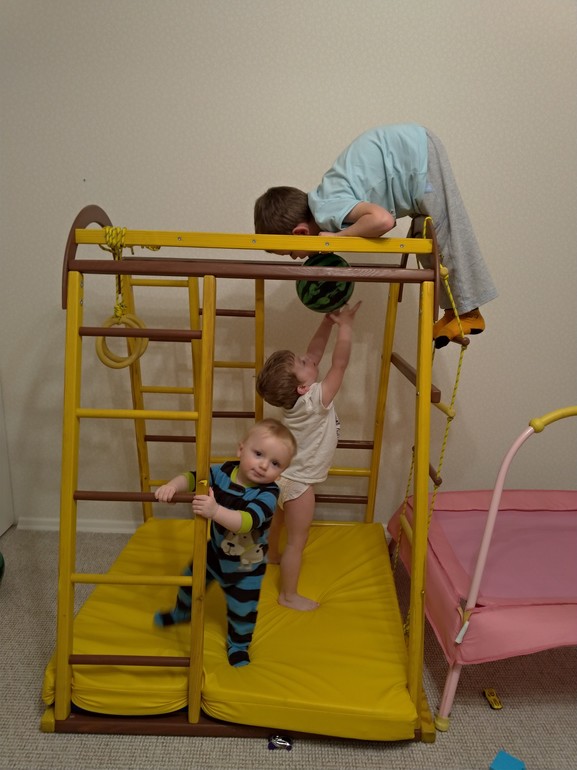 Имеем напольный спорткомплеск с 1.4 года старшего, и вот его и в хвост и в гриву дети используют ежедневно. Что очень нравится - что с какой бы стороны ты ни забрался, можешь по комплексу бежать куда угодно - и вправо, и влево, и наверх, и вниз, и по горке, и под горкой, и по периметру. Такие скачки на нем и вокруг устраивают, в период сидения дома бесценно. И по росту всем троим замечательно (старшему еще года на полтора хватит). Минус один - когда они все трое там (уже целый месяц они трое там с утра до вечера), то тесно, вечно бьются друг о друга.