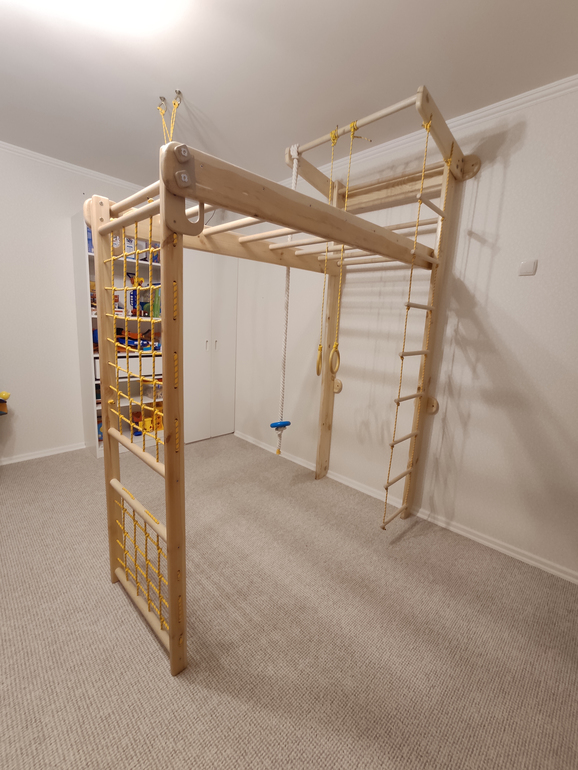 фото не очень красивое,но приблизительно понятно что и как,это ещё в процессе. Слева вот веревочная лестница,внутри ещё качели есть, тарзанка съёмная,тут на фото ее ещё нет.