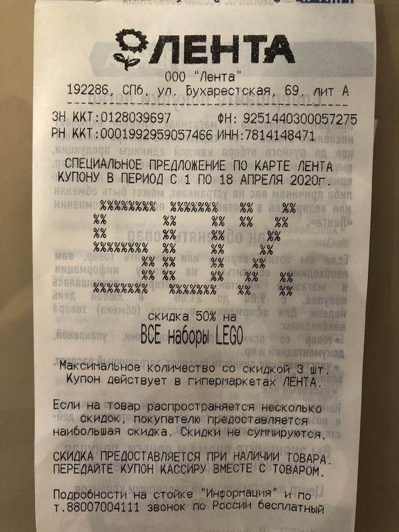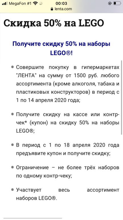 Распродажи. Скидки. Акции.В Ленте дают купон на скидку 50% на все наборы LEGO с 1 по 18 апреля: