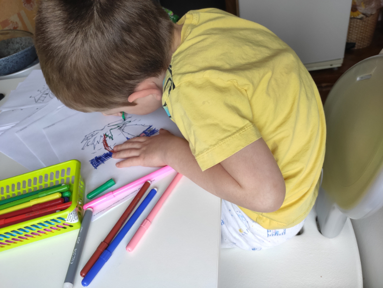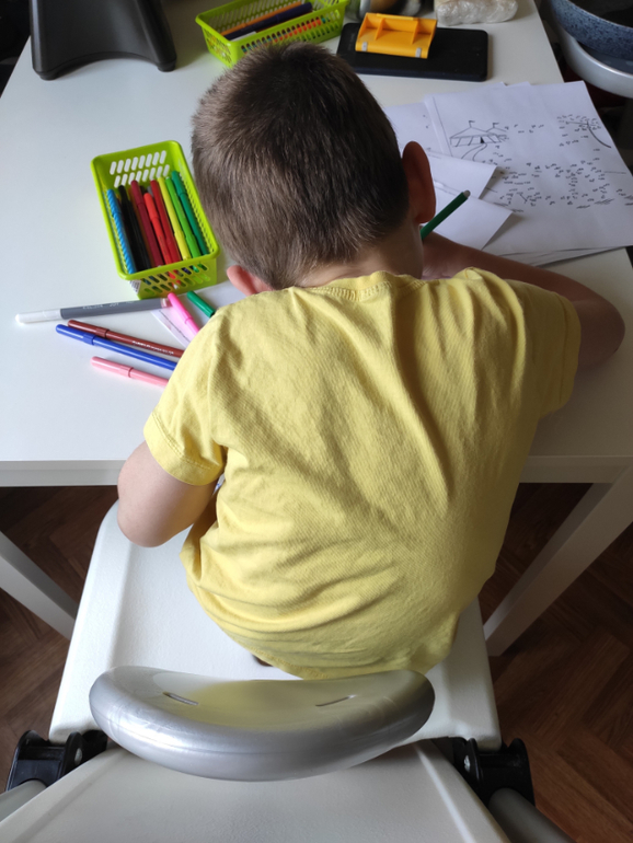 Сейчас в детской обычный стол, обычный стул, сидит по понятным причинам криво, добавлю фото ужаса через пару минут. На кухне у нас есть 2 растущих стула, старший уступил свой стул младшему полгода назад, сам сел на обычный. И с тех пор скривился. Сейчас на кухне стараюсь сажать на растущий, но тоже кривится на нем, видимо, уже привычка, постоянно поправляю, минут на 5 хватает и "уползает" снова.