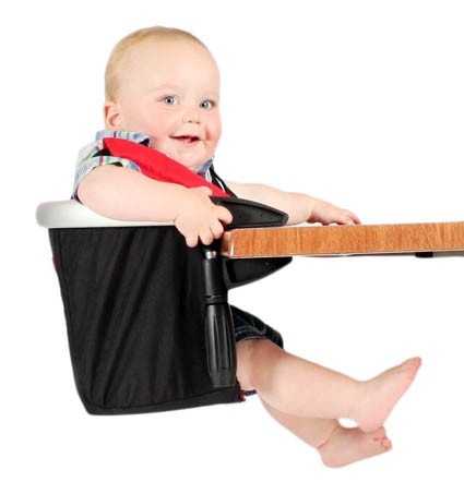 У меня такой пластиковый стул был, который к обычному стулу крепиться, как на фото ниже. Сейчас продаю. Очень удобный. Только я столик не использовала, а к общему столу двигала, так ещё компактнее)