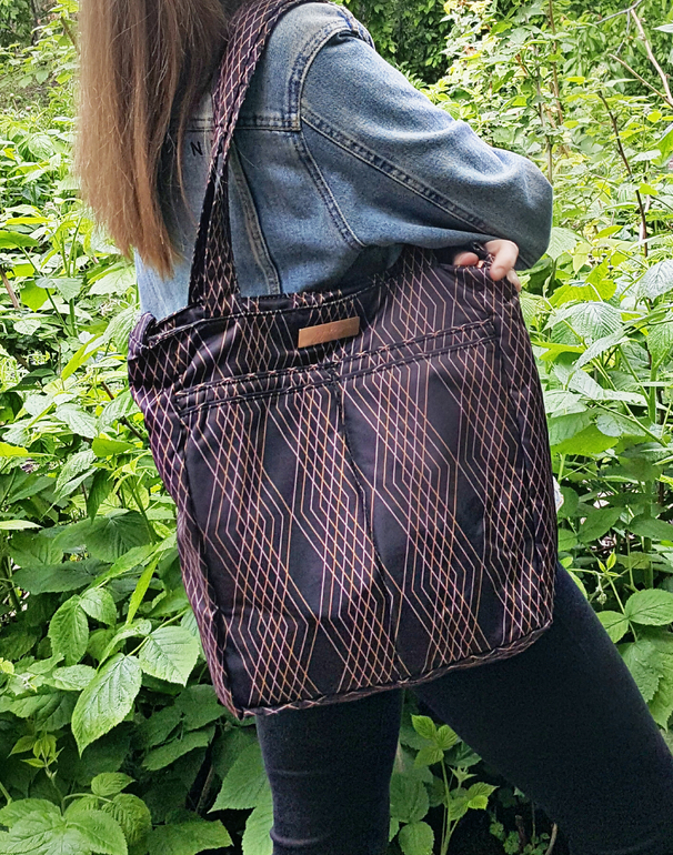Ее вес всего 180 грамм, и помещается в нее достаточно много вещей. В наполненном виде, сумка выглядит так: