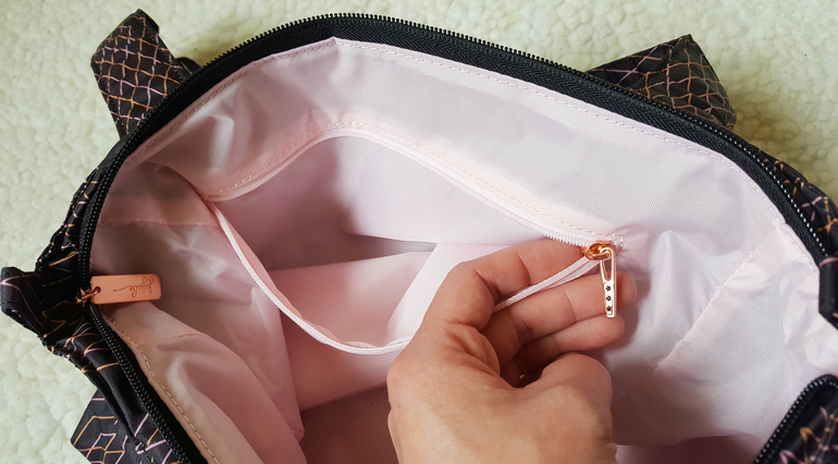 Внутри сумки, симпатичный розовый подклад, и один боковой карман на молнии.