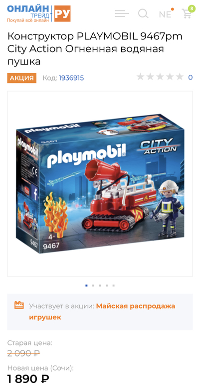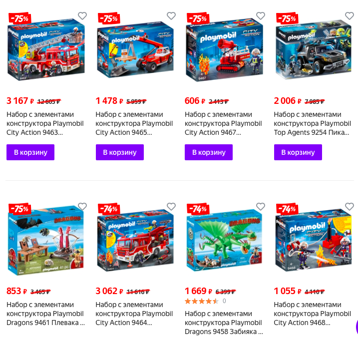 :) 2018 год это коллекция, которая распродается со склада, а не закупается за валюту из Европы сейчас. Повторюсь, что с введением режима самоизоляции хорошие цены на Playmobil - это завышенная в десятки раз первоначальный цена и мифическая огромная скидка, которая снижает стоимость до нормальной цены.. Цены в "Фамилии", думаю, не показательны :) я не упоминаю случаи, когда, полицейская машина playmobil (свет/звук) была куплена в интернет-магазине за 300 рублей, катер с дельфинами - рублей за 400, а роскошный отель (с лифтом) - за 3500.. Цены на gulliver-toys и onlinetrade практически всегда были ниже, чем у конкурентов в онлайн-пространстве, а с реальными скидками вообще невысокими..