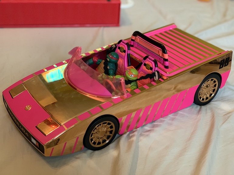 Пока панцеробуса нет, сын катает черепашек в розовом кабриолете))