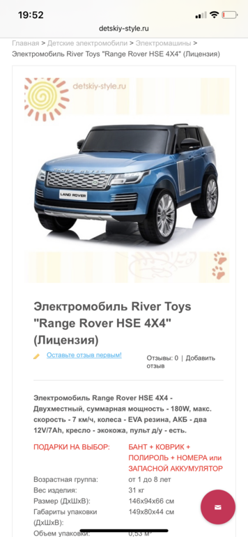 Подарили на 2г.Большой,помещаются двое.Муж купил мощный аккумулятор,за неделю не сел,катались каждый день.Родной аккумулятор сел через полчаса.