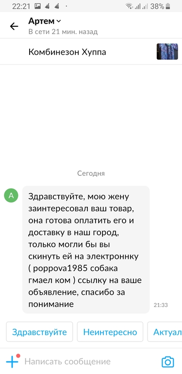 Заблокируйте и все. Думаю как пишут ниже пытаются вывести переписку на другой сайт,мне Авито. Я во всех объявлениях пишу что вся переписка на сайте.