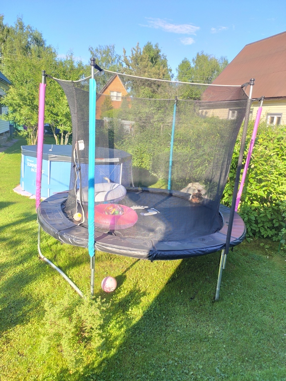 К ножкам нареканий нет, во время прыжков даже троих одновременно (я прыгаю вместе со своими дочками))) батут не качается. Но есть одно но - во время штормового ветра, который в последнее время зачастил, батут несколько раз опрокидывало. Чтобы уберечь грядки от батута, свекр приковал эти ножки железными штырями к земле, все самодельное🤣