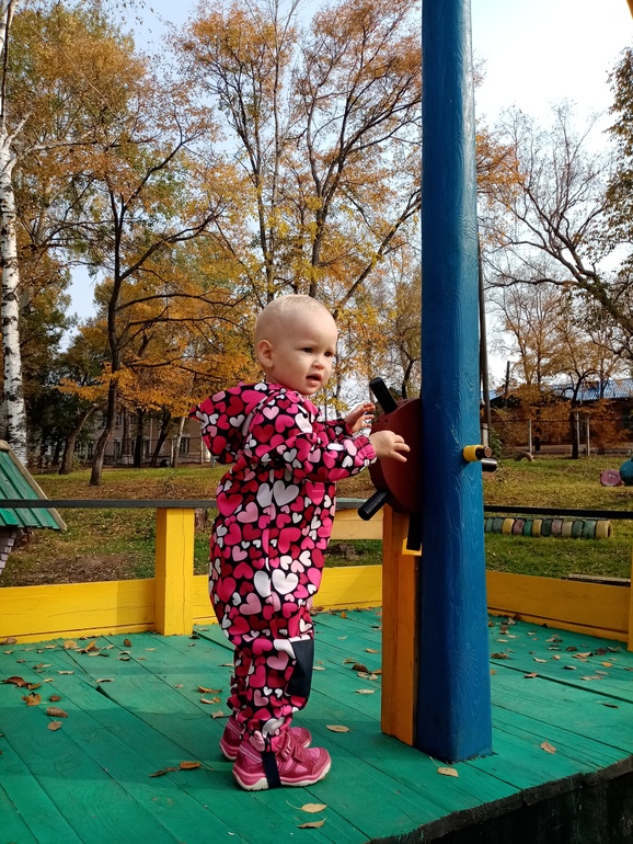 2.2, мальчик. Обожает всякие большие деревянные машины, у нас на площадке есть скорая помощь, цементовоз, автобус. И ещё длинная штука - поезд, с одной стороны горка, с другой ступеньки, а посередине подвесные элементы, на них очень нравится раскачиваться.