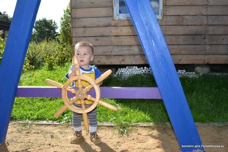 У нас в парке корабль деревянный, мои в прошлом году тоже со штурвалом зависали оба, Паша говорил, что он пират или капитан, придумывал сюжет. В этом году ещё не были, но уже оба играют в сюжетно-ролевые игры весьма активно. Вот фото с прошлого года. Ещё есть там же машина деревянная, тоже с рулём. А так обычно тоже лазалки сейчас в почёте.