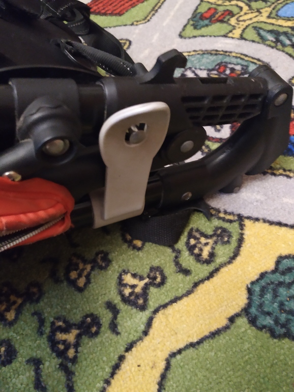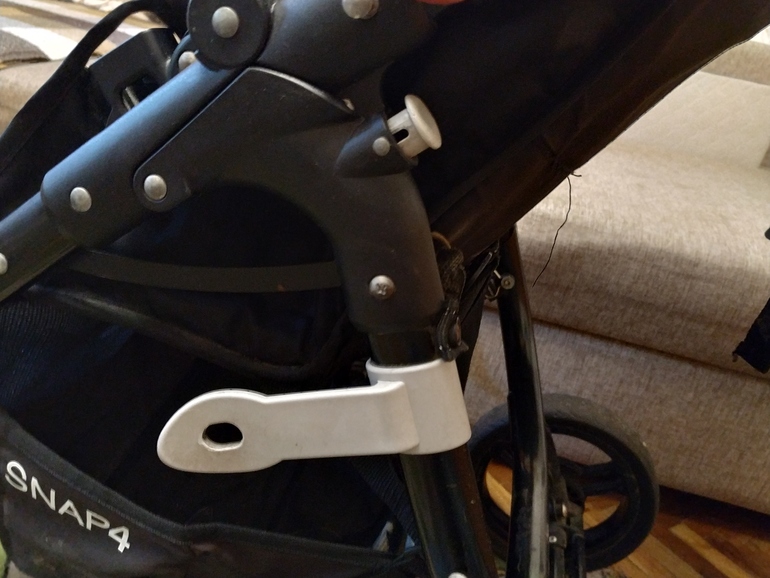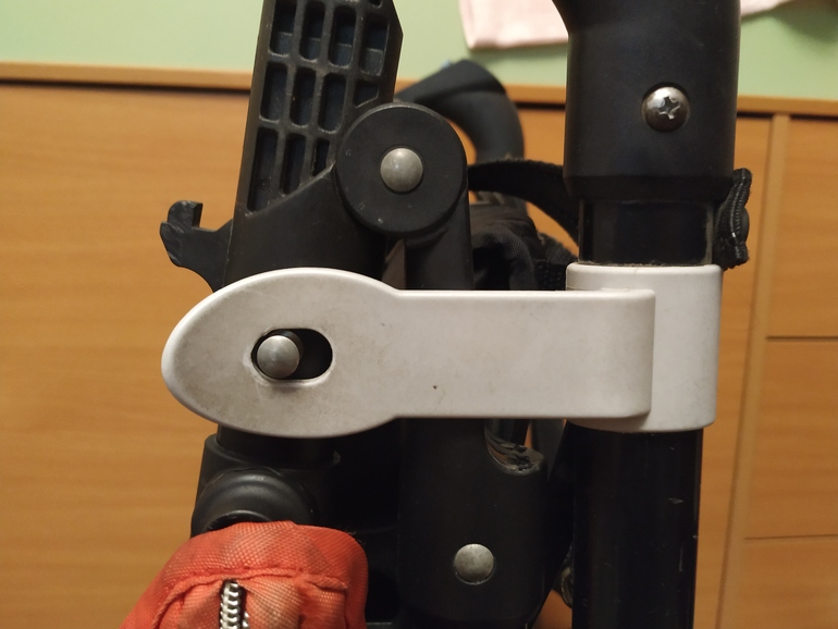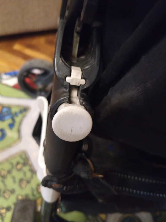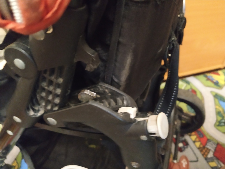 Поняла,у вас сломан крючок,при раскладывании коляски,этот крючок зацепляется за другую деталь -кнопку и коляска держится разложенной.Не правильно,за кнопку он держится.