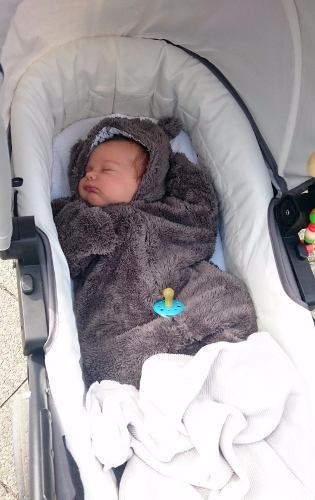 В марте пересели в прогулку, купили футмуф, и курточку обычную дутик, в апреле софтшеллкомбез (уже выпускали с коляски постоять/ползать).