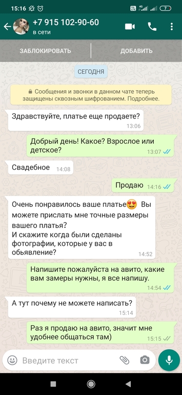Ну мне всюду пишут, почему развод сразу? Я вижу нормальную беседу с ее стороны... Удобнее ей Вотс ап, сами же указали номер. Авито приложение тупит и виснет, фото там прикрепляются не всегда...
