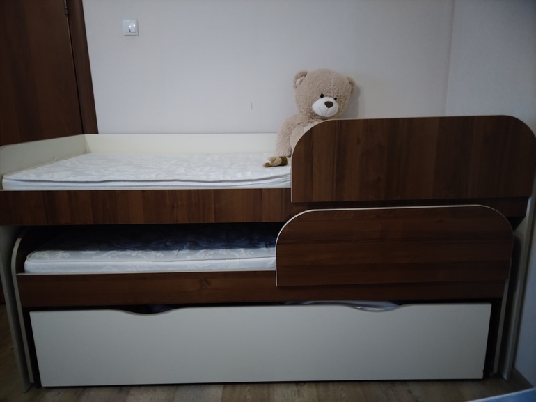 Минус выкатной для меня- днём у одного ребенка нет своего места( посидеть- полежать). Может в два года это и не актуально, но со временем захочется свою кровать днём