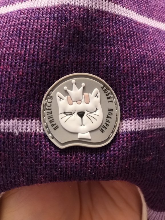 Получила вчера шапку и меня ужасно бесит этот значок, усы и веснушки котика перекошены, надпись тоже съехала.