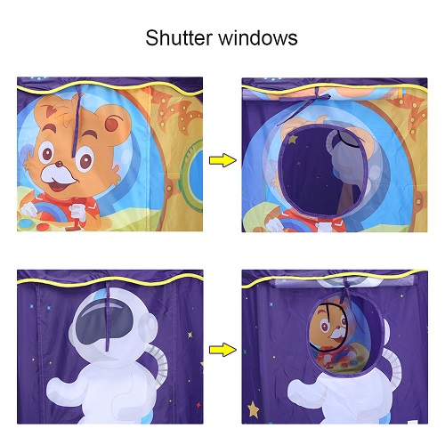 В крыше вот эти белые кружки в виде метеоритов сделаны из сетки, через них можно подглядывать. И по бокам два окошка со шторками.