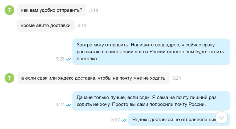 Черный список и жалобыТеперь вместо авито-доставки они прикидываются СДЕКом или Яндекс-доставкой. Правила те же, костюмы - другие. Разве авито-мошенники просят отправлять посылки Почтой России? Вот у меня такого еще не было. Поэтому я сначала купилась. Думала, будет 100% предоплата, как обычно.