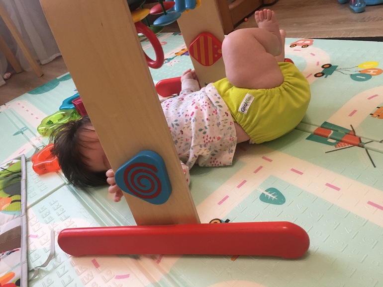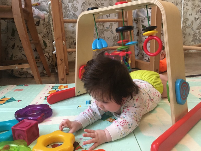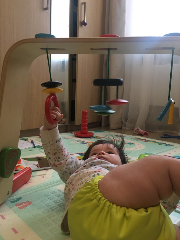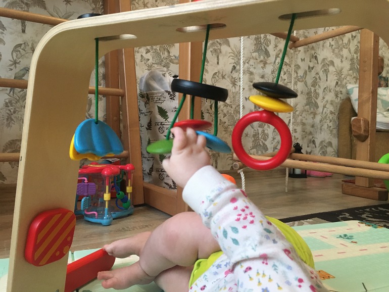 Сейчас нам 5 месяцев, и у дочки эта дуга одна из любимых занятий, на ней всего три подвеса, но!!!! За один можно схватиться ( не забываем крутить дугу, что бы ребёнок чередовал руки)