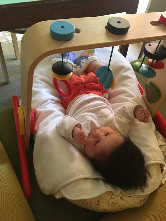 Итак, сначала малышку клада в коконе- получались подвесы близко и она отлично на них фокусировалась ( помним, развитие зрительного восприятия продолжается после рождения и ребёнку просто необходимы дополнительные цветовые стимулы контрастных ярких цветов)