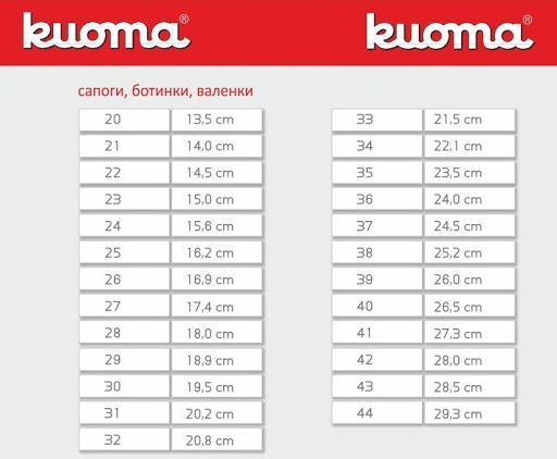 что то вы погорячились, какой 22-23?? у нас сейчас нога 16см, прошлогодний 23 размер легко налезает. Беру 24 на эту зиму и то на носок толстый. Вам нужен 19 размер, ведь зима уже наступает и носить сейчас, а не через полгода. В обуви с запасом больше1.5 см ходить невозможно. И даже в 19ом размере утонете, ведь Куома прилично большемерит
