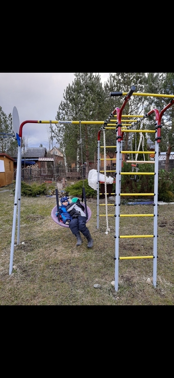 А на участке у нас ДСК Пионер. К ней ему по настроению привешиваем классические качели, малышковые, или гнездо диаметром 110 (влезает 2 ребёнка, можно и поменьше брать)