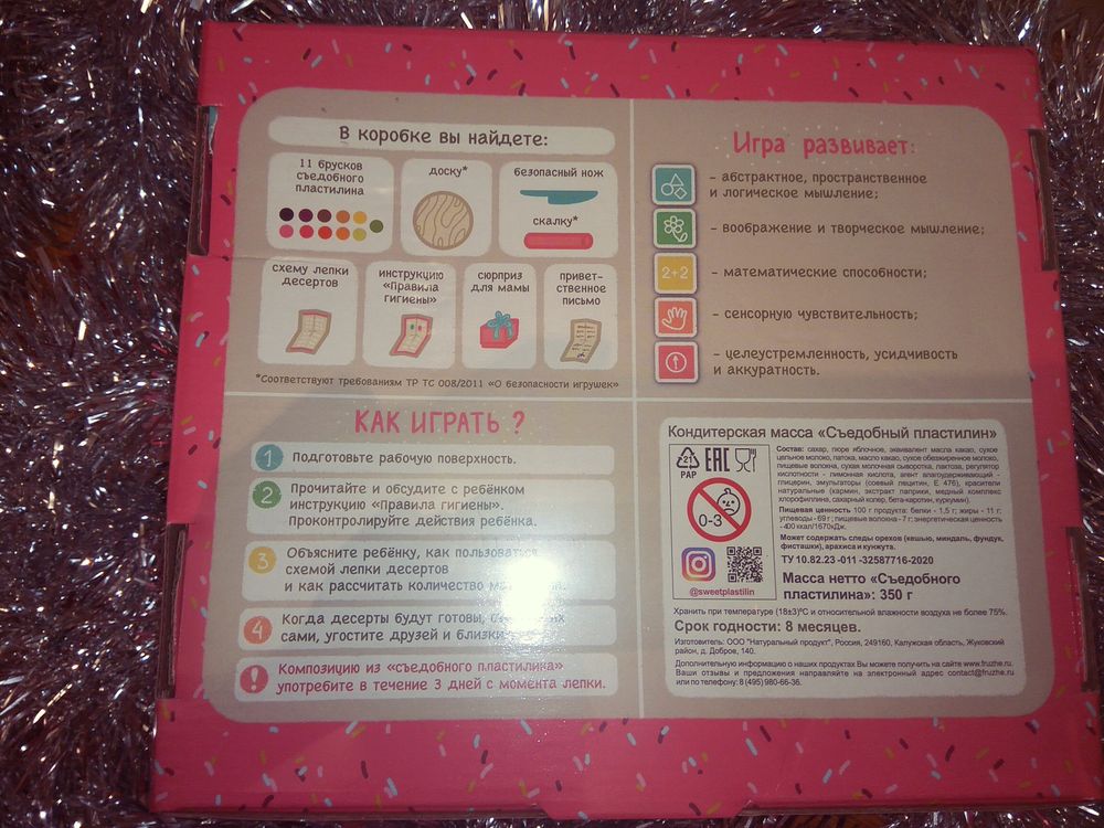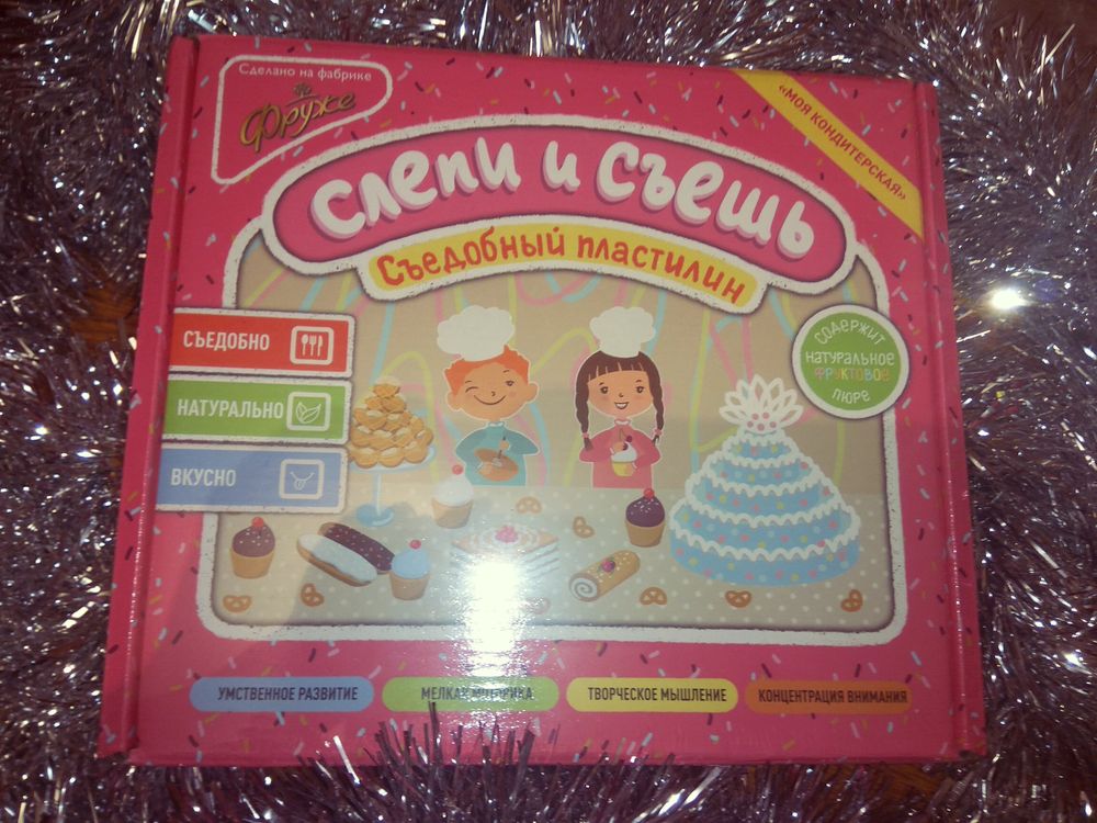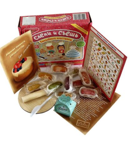Набор съедобного пластилина - уникальная развивающая игра для детей, позволяющая слепить из брусков цветного съедобного пластилина различные традиционные пирожные французской кухни, а потом их съесть. Набор съедобного пластилина является одновременно и кондитерским изделием, и развивающей игрой. Это вкусный продукт с натуральным составом, который имеет ярко выраженный яблочный вкус. Масса пластична, не прилипает к рукам и приятна на ощупь. Для придания цвета кондитерской массе используются только натуральные красители. В комплекте деревянные доска и скалка, которые соответствуют требованиям ТРТС 008/2011 о безопасности игрушек.