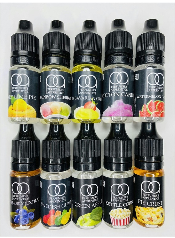Большой набор отдушек: черника, лимонный пирог, мармеладные рыбки, радужный щербет, зеленое яблоко, баварский крем, попкорн, сладкая вата, хрустяшки, арбузная конфета.