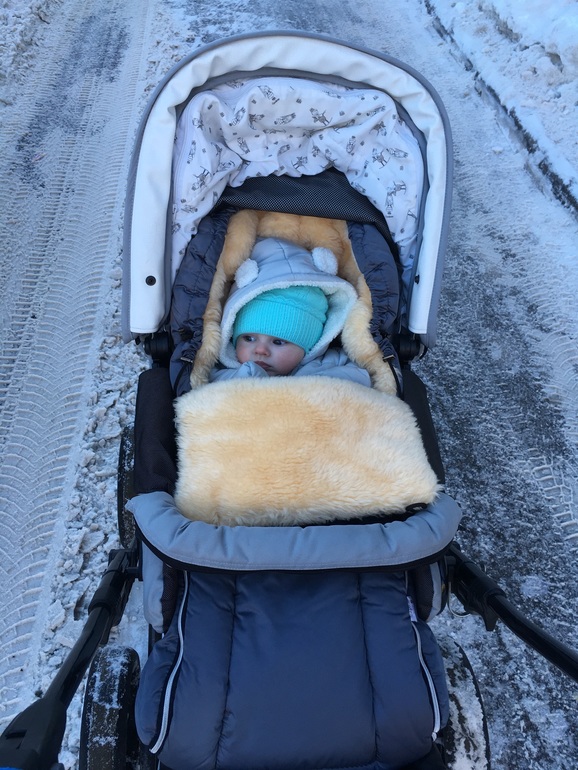 На фото ребёнку 6 месяцев примерно, было морозно, с меховым конвертом мне прогулочный блок показался не очень широким.