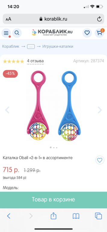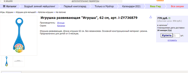 Есть аналогичная каталка от "Игруша" всё то же самое, только мячик внутри другой. На Майшопе стоит 770 р. https://my-shop.ru/shop/product/3881442.html?b45=1_1 У кого там скидка -25%, будет еще дешевле. Или введите код PICKPOINT (он на -10%) у меня срабатывает через раз, без разницы какой способ доставки и какая сумма.
