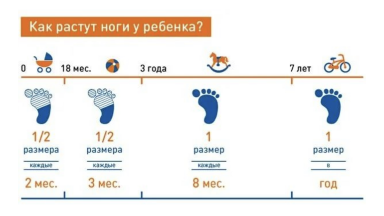 Схема условная. Вроде нога планомерно растёт, покупаешь обувь, угадываешь размер, хвалишь себя, какая предусмотрительная мама, все посчитала, чувствуешь, что контролируешь ситуацию, расслабляешься. А потом бац! И резкий скачек на 1-2 см в районе 3-6 лет. И вся купленная заранее обувь мала. Это не только мой опыт, но и многих моих знакомых, увы(
