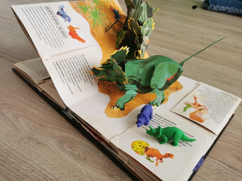 Шикарнейшая книга. Немного рановато, Лев в основном рассматривает, на слух пока сложно ему воспринимать информацию. В купе с динозаврами от Learning Resources (специально ещё до НГ ему по штучке в день вручали за что-нибудь хорошее) очень даже интересно ребенку