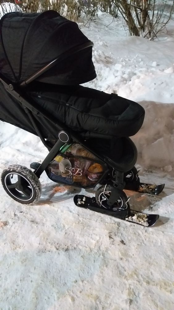 У меня есть лыжи на коляску.. Это очень не удобно, так как коляску надо завозить и вывозить из квартиры, их там пристегивать /Отстегивать надо.