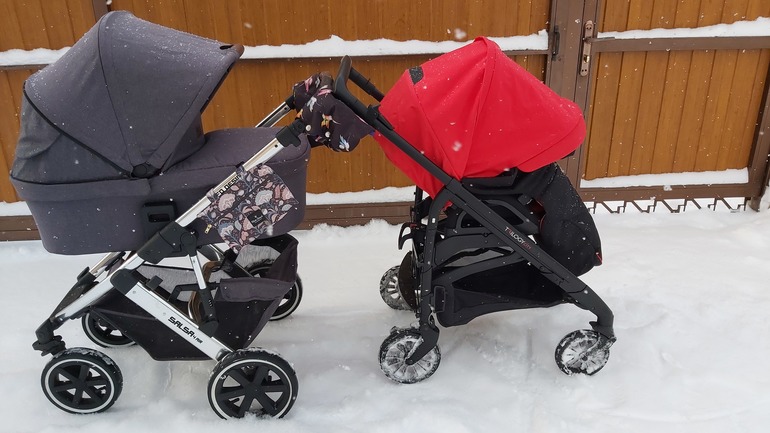 Да мы конверт теплый используем. Но для прогулок у нас другая коляска. Вот фото по сравнению с большой. Складывается удобно. Сама стоит.