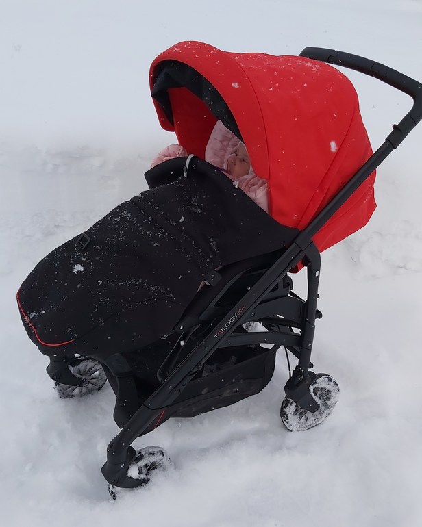 по снегу едет. Но трясёт. У нас она для поездок и магазинов . Ребенка возим в ней с 2х месяцев. Довольно ровное спальное место. Реверсивный прог блок.