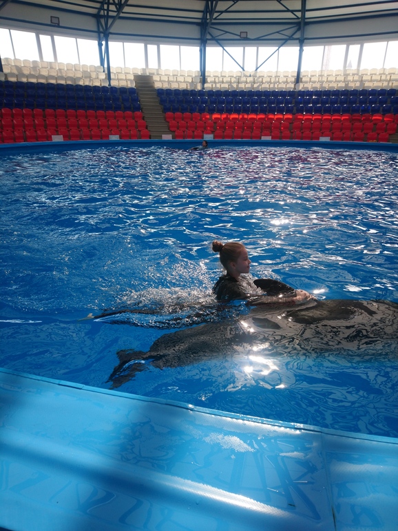 Я плавала с дельфином в Минском дельфинарии, было страшно. Вода очень холодная и дельфины зубастые! Клыков полный рот, и каждый огромный!