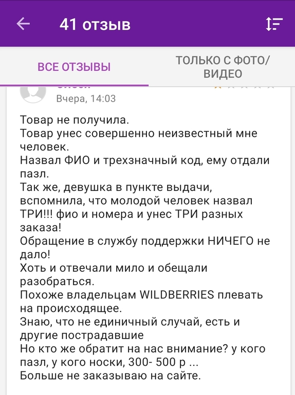 У Озона, кстати, вообще последнее время расслабленно как-то - просто ФИО называешь, и отдают. И номер заказа не просят... Думала в ВБ с этим чуть надёжнее, а тут такой отзыв.