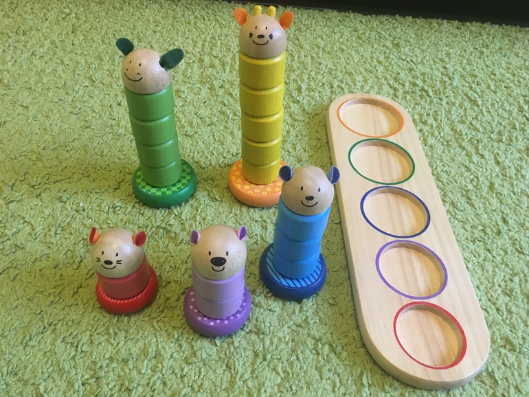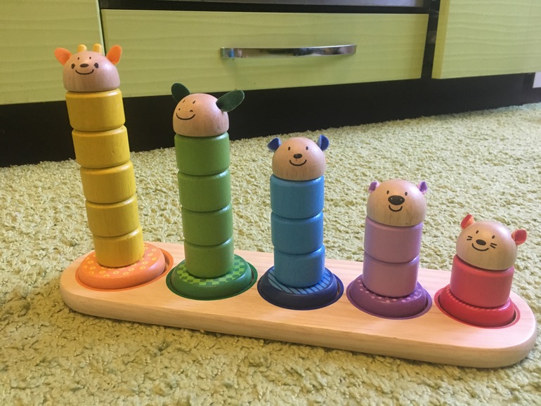 Пирамидки снимаются с доски- подставки, те при разборе мы получаем 5!!!! Отдельных пирамидок, а не доску с штырями, как у игры «день-ночь». Это здорово, в плане безопасности и разнообразия- можно маленьким давать разные пирамидки или использовать конкретную при изучении определенного цвета.