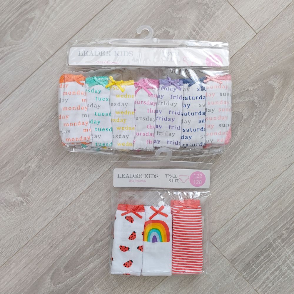 Трусы - верхние 7шт за 299р, нижние 3шт за 199р. Можно было взять наборы из 3шт за 149р в других расцветках, но дочке понравились эти. У меня у дочки сейчас все трусы из ДС, больше года назад набрала там почти бесплатно. Носятся отлично👌.