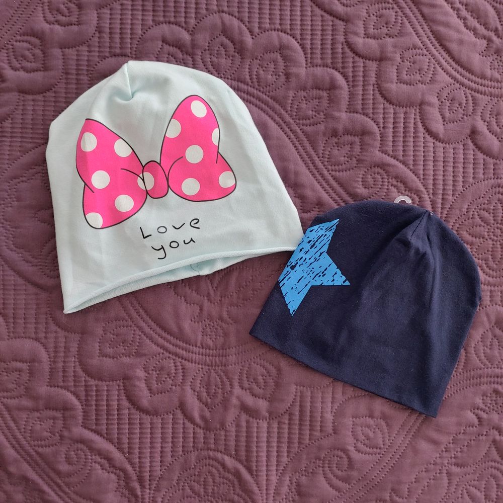 Дочке и сыну по шапке, обе 50-52р (девчачья имхо большемерит) - обе по 99руб. Синяя - двойной трикотаж.
