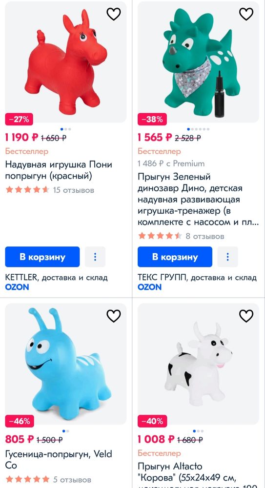 У нас как раз такой что на последнем фото - Дино из ELC. Мелкий прыгал очень активно с 1,3 до 1,6. Он очень хороший, устойчивый за счёт ног врастопырку, а за рога удобно держаться. Да и качественный. Но в целом берите любой, Altacto ничуть не хуже для прыгания, мы в гостях на таком красном коне прыгали.