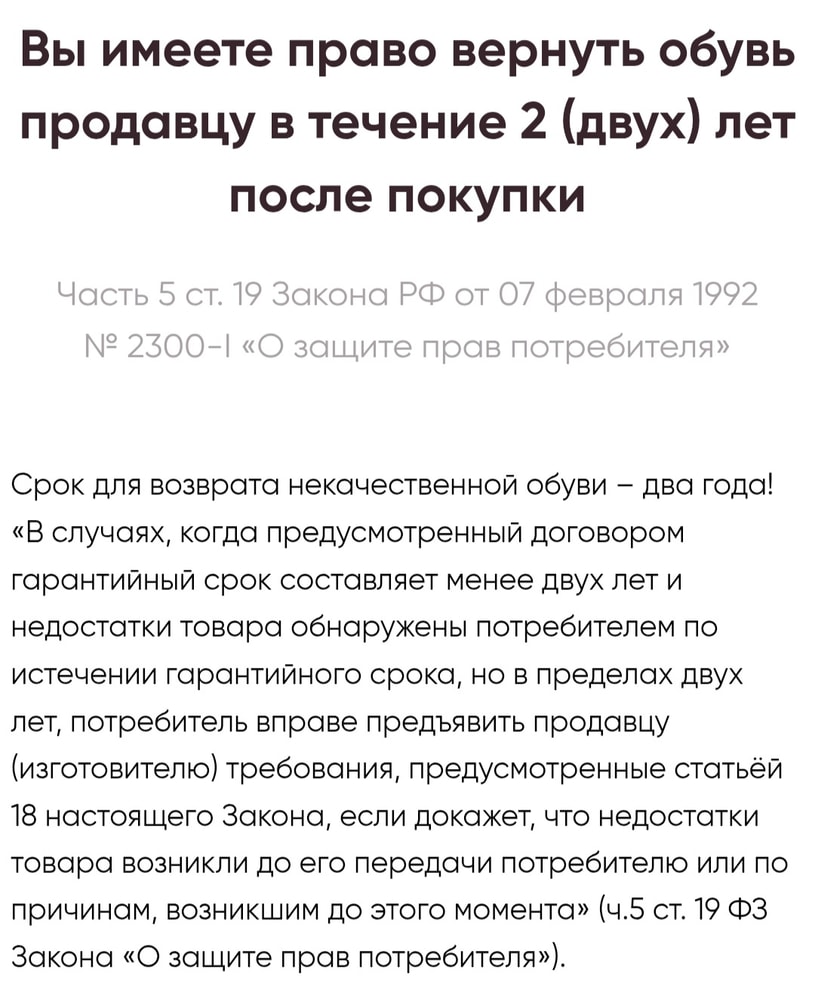 Год назад (20.05) на вб были куплены полуботиники мужские (франческо донни). Муж носил их лето, осень, весну. Сегодня утром муж пожаловался на мокрые ноги, посмотрел подошвы, обе подошвы лопнули. На вб к возврату доступны только товары, купленные год назад. Мы "опоздали" на 7 дней.. написала на вб, они пишут решайте вопрос с продавцом. Продавец написал, что гарантия год. Это неправда. Гарантийный срок на обувь - 2 года! Хочу добиться возврата. Прошу поделиться опытом, кто в подобных обстоятельствах делал возврат. Спасибо