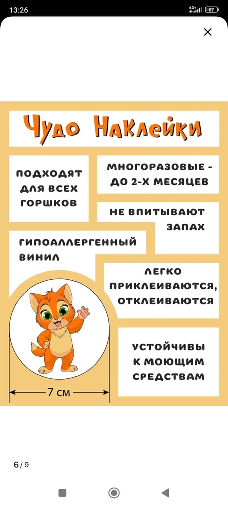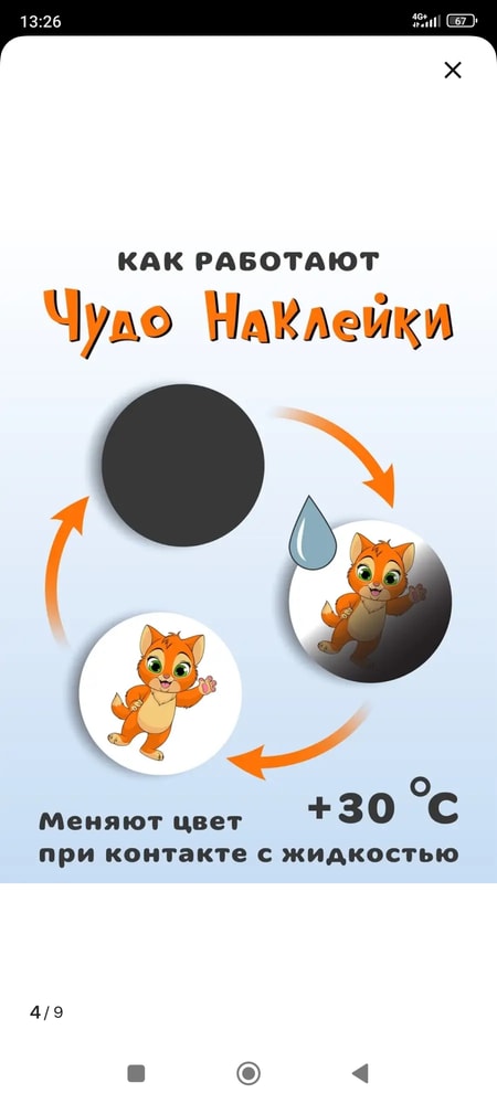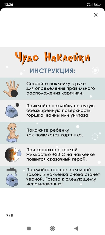 Работает так: наклеивать наклейку в горшок, она выглядит как чёрный круг, но когда на неё писает ребёнок (жидкость тёплая попадает) , чёрная наклейка становится яркой картинкой)) после того как ополаскиваешь холодной водой наклейка снова - чёрный круг))
