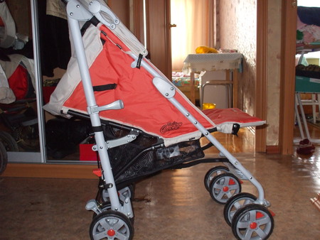 ну почти лежа)))как буд то на подушке)))одна подножка в низу для больших деток,а вторая регулируемая.ну корзины для покупок нет единственный минус.а остальное все супер-складывается легко и компактно,легкая,передние колеса пооротные.эта коляска на рынке 8 лет.