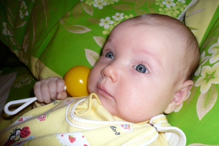 в месяц уже пора познакомится и с простой погремушкой - она должна быть Яркой, звонкой и удобно держаться детской ручкой. Впрочем мы с такой познакомились уже в роддоме на 3-й день (я просила мужа принести) - следили глазками и поворачивали головку на ее звук ..