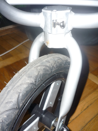 Маленький (но очень удобный) плюс - это тормозная труба, а на ней пластмассовый бугристый выступ. Очень удобно фиксировать тормоз, нога не скользит!